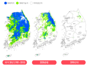 단풍만이 아니라 사과, 배, 배추, 전어 등 가을의 풍경을 채워온 식물과 음식도 기후 변화의 영향을 받고 있습니다. 우리나라에서 사과가 사라질 수 있다는 이야기를 들어보셨나요? 농촌진흥청은 ‘사과 재배지 변동 예측지도’를 통해 주요 과일 재배 지역 전망을 내놓았는데요.