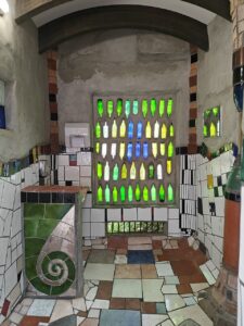 1999년 완공된 이 공중화장실은 세라믹 조각, 재활용 유리병, 옛 은행의 벽돌 등 버려진 재료들로 디자인되었습니다. 색색의 기둥과 불규칙한 타일, 색유리 창문은 환상적인 분위기를 자아내며, 지역 주민들이 직접 시공에 참여해 의미를 더했습니다. 나무를 ‘건물의 세입자’라 부를 만큼 자연과의 공존을 철학으로 삼은 그는, 지붕 위에는 나무가 자라는 생태 지붕을 올리고 황금빛 구체 환기구를 설치했습니다.