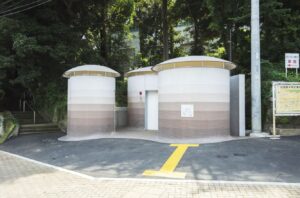 영화 <퍼펙트 데이즈>에 등장한 반 시게루의 투명 유리 화장실은 프로젝트의 대표작인데요. 색색의 통유리로 감싸인 이 화장실은 밖에서 내부가 훤히 들여다보입니다. 이는 “안에 누군가 숨어 있지는 않을까?”, “불결하지는 않을까?”라는 불안을 해소해줍니다. 문을 잠그면, 전기 신호를 통해 유리가 불투명해지며 프라이버시가 확보되는 구조입니다. 요요기하치만 공중화장실은 이토 도요오가 버섯을 모티브로 설계한 공간인데요. 3개 동으로 나뉘어 사방이 트인 구조는 방범 효과를 높이는 동시에, 뒤편 신사의 숲과 자연스럽게 어우러집니다.
