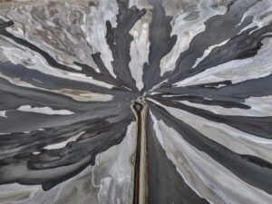 다이아몬드 채굴 후 남은 폐기물(킴벌라이트)이 물과 섞여 슬러리 형태로 흐르는 모습입니다. 킴벌라이트의 명칭은 이도시의 명칭에서 따온 것으로 전해집니다. 푸른빛과 흙빛이 뒤엉켜 마치 한 폭의 추상화 처럼 보입니다. 우리가 아름다운 보석을 얻기 위해 땅에 어떤 흔적을 남기는지 보여줍니다.