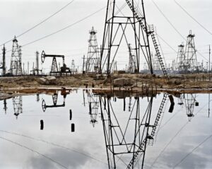 1999년부터 2008년까지 버틴스키는 글로벌 석유 시장을 해부한 ‘오일 시리즈’에 집중했습니다. 수출의 절대 다수를 석유에 의존하는 아제르바이잔의 소카르 유전의 풍경으로, 짙은 원유가 수면을 뒤덮고 그 위로 차가운 산업 구조물이 데칼코마니처럼 비칩니다.